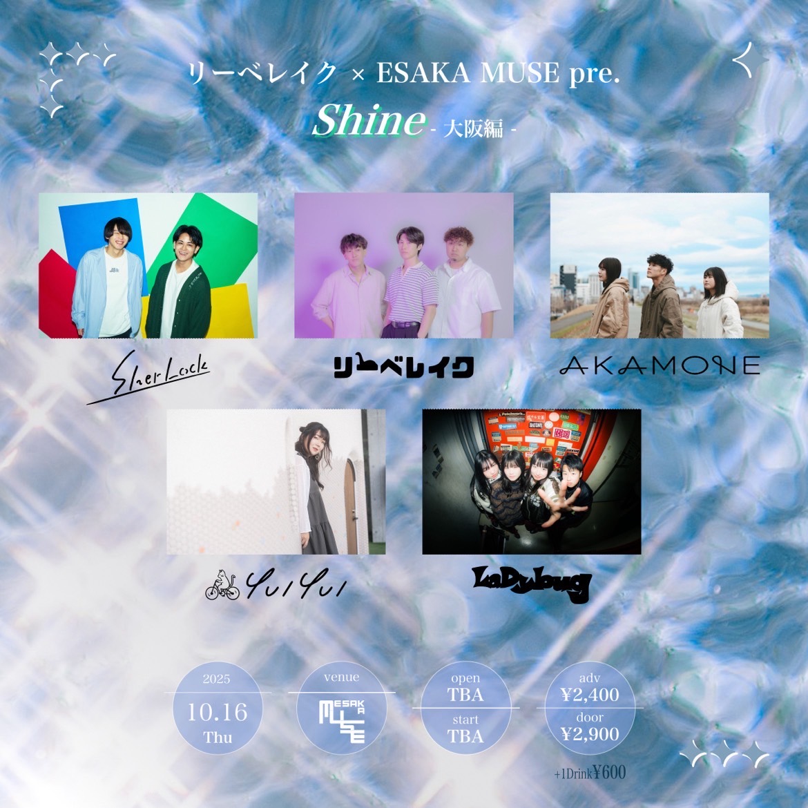 2025.10.16(Thu) ESAKA MUSE SCHEDULE コピー 2025.09.06 リーベレイク×ESAKA MUSE pre. 「Shine−大阪編−」 OPEN TBA / START TBA TICKET : ADV ¥2,400- / DOOR ¥2,900- (+1D) ご予約はDMまたはこちら