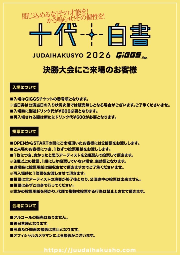 2026.3.30(Mon) 心斎橋BIGCAT SCHEDULE コピー 2026.01.16 「十代白書2026 GIGGS by Eggs 決勝大会」 OPEN 11:45 / START 12:30 TICKET ¥0- ( +1D ¥600) ご予約はこちら